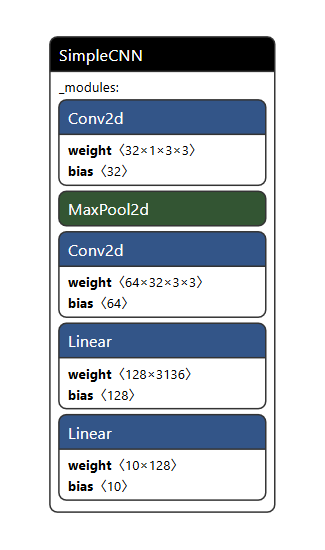 class SimpleCNN(nn.Module): def __init__(self): """ 模型初始化函数,定义网络层结构 """ super(SimpleCNN, self).__init__() self.conv1 = nn.Conv2d(in_channels=1, out_channels=32, kernel_size=3, padding=1) self.conv2 = nn.Conv2d(in_channels=32, out_channels=64, kernel_size=3, padding=1) self.fc1 = nn.Linear(3136, 128) self.fc2 = nn.Linear(128, 10)