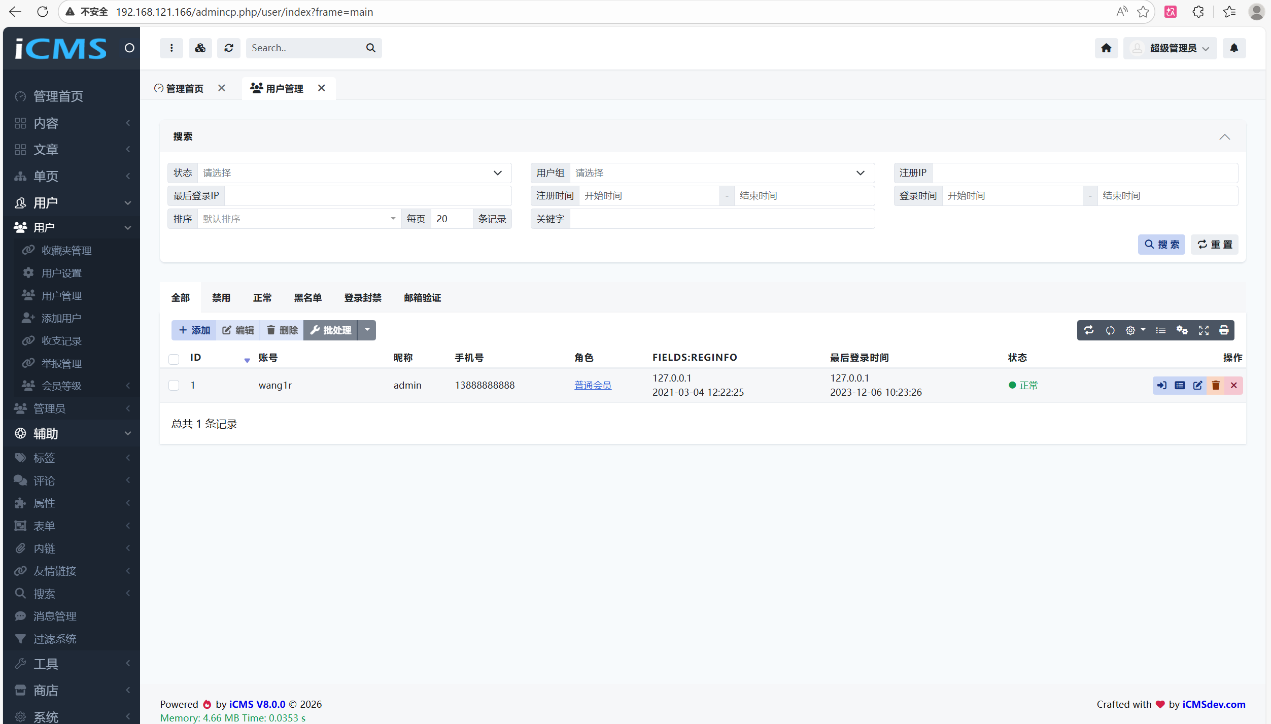 iCMS v8.0.0 contains a Reflected Cross-Site Scripting (XSS) vulnerability in the User Management component. The application directly echoes the regip and loginip GET parameters into the HTML value attribute without proper sanitization or escaping. This allows remote attackers to execute arbitrary web script or HTML.